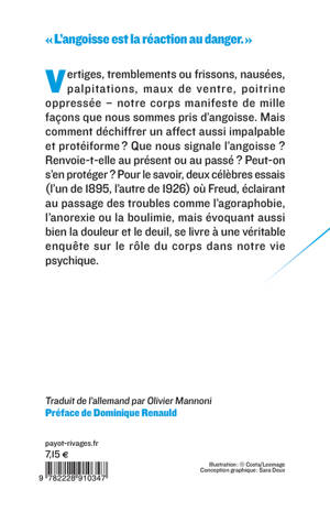 Vertiges, tremblements ou frissons, nausées, palpitations, maux de ventre, poitrine oppressée - notre corps manifeste de mille façons que nous sommes pris d'angoisse. Mais comment déchiffrer un affect aussi impalpable et protéiforme ? Que nous signale l'angoisse ? Renvoie-t-elle au présent ou au passé ? Peut-on s'en protéger ? Pour le savoir, deux célèbres essais (l'un de 1895, l'autre de 1926) où Freud ‒ éclairant au passage des troubles comme l'agoraphobie, l'anorexie ou la boulimie, mais évoquant aussi bien la douleur et le deuil ‒ se livre à une véritable enquête sur le rôle du corps dans notre vie psychique.