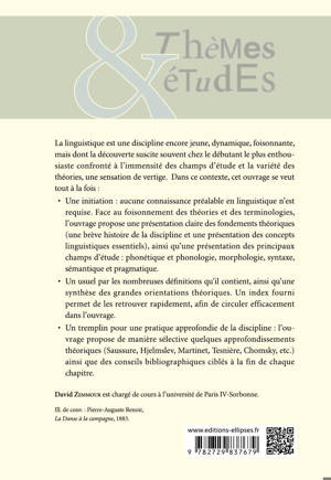 - Une initiation : aucune connaissance préalable en linguistique n'est requise. Face au foisonnement des théories et des terminologies, l'ouvrage propose une présentation claire des fondements théorique (une brève histoire de la discipline et une présentation des principaux champs d'étude : phonétique et phonologie, morphologie, syntaxe, sémantique et pragmatique.