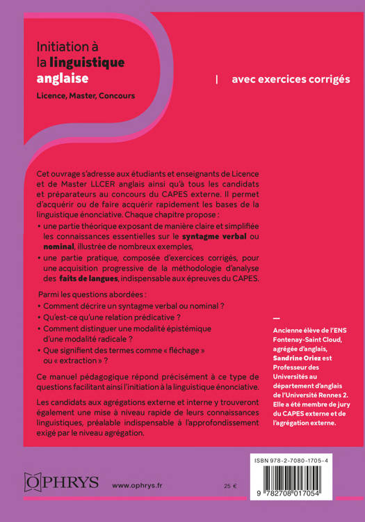 Cet ouvrage s’adresse aux étudiants et enseignants de Licence et de Master LLCER anglais ainsi qu’à tous les candidats et préparateurs au concours du CAPES externe. Il permet d’acquérir ou de faire acquérir rapidement les bases de la linguistique énonciative.