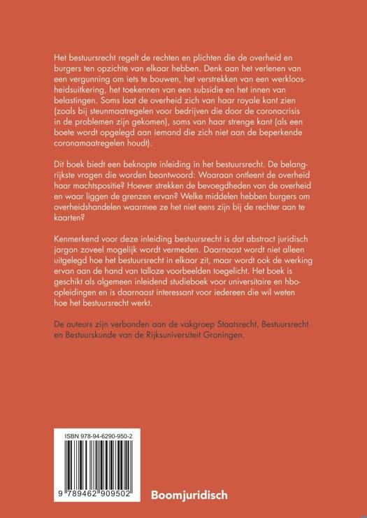 Dit boek biedt een beknopte inleiding in het bestuursrecht. De belangrijkste vragen die worden beantwoord: Waaraan ontleent de overheid haar machtspositie? Hoever strekken de bevoegdheden van de overheid en waar liggen de grenzen ervan? Welke middelen hebben burgers om overheidshandelen waarmee ze het niet eens zijn bij de rechter aan te kaarten?