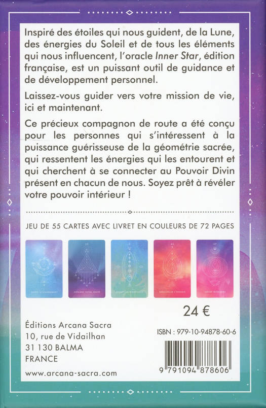 Voyagez au coeur des royaumes intérieurs de votre esprit Ce magnifique oracle aux couleurs chatoyantes fait appel à votre sagesse intérieure, à votre imagination et à votre intuition. Ses cartes singulières sont inspirées de la géométrie sacrée, de l'astrologie, des étoiles qui nous guident, de la Lune, des énergies du Soleil et de tous les éléments qui nous influencent. Chaque carte a été canalisée de manière intuitive pour mettre en lumière un aspect de votre personnalité en lien avec l'astrologie et vous aider à vous rappeler qui vous êtes et pourquoi vous êtes ici… Parce que les énergies vous guident dans votre mission de vie, l’auteure de ce jeu vous propose de débloquer en douceur certaines parties de votre esprit, de vous aider à lui faire confiance. Elle met ainsi à votre disposition un précieux outil qui vous permettra de recevoir les conseils de vos guides et de vous mettre sur la voie d’une vie inspirée. Vous pouvez tirer une carte quotidienne, pour vous dévoiler l’intention du jour, ou bien à l’occasion, lorsque vous recherchez la réponse à une question particulière. Quelle que soit la méthode, chaque carte vous délivre un message pour vous aider à avancer sereinement sur le chemin qui est le vôtre. Outil puissant de guidance et de développement personnel, l’oracle Inner Star a été conçu pour les personnes qui s’intéressent à la magie des sigils, ressentent les énergies qui les entourent et cherchent à nourrir leur âme... À propos de l’auteure : Jo Klima est une artiste qui aime voir naître des projets créatifs. Elle met un point d’honneur à égayer le monde de couleurs, de signification et de beauté. Son art lui permet de se découvrir et de se comprendre plus profondément, mais aussi d’aider autrui à emprunter la même voie… Solidement connectée à son intuition et son esprit intérieur, elle trouve l’inspiration visuelle dans la géométrie et le symbolisme sacré, les animaux, les cristaux, la nature, l’astrologie et, bien sûr, le design.