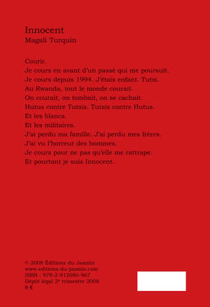 Courir. Je cours en avant d’un passé qui me poursuit. Je cours depuis 1994. J’étais enfant. Tutsi. Au Rwanda, tout le monde courait. On courait, on tombait, on se cachait. Hutus contre Tutsis. Tutsis contre Hutus. Et les blancs. Et les militaires. J’ai perdu ma famille. J’ai perdu mes frères. J’ai vu l’horreur des hommes. Je cours pour ne pas qu’elle me rattrape. Et pourtant je suis Innocent.