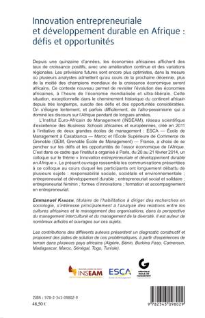 Depuis une quinzaine d’années, les économies africaines affichent des taux de croissance positifs. Au cours de la prochaine décennie, plus de la moitié des champions mondiaux de la croissance économique seront africains? On s'éloigne de l'afropessimisme qui a longtemps dominé. L'ouvrage se penche sur les défis et les opportunités de cet essor économique. Ces communications abordent : la responsabilité sociale, sociétale et environnementale, l'entrepreneuriat et le développement durable, social et solidaire, l'entrepreneuriat féminin et ses innovations.