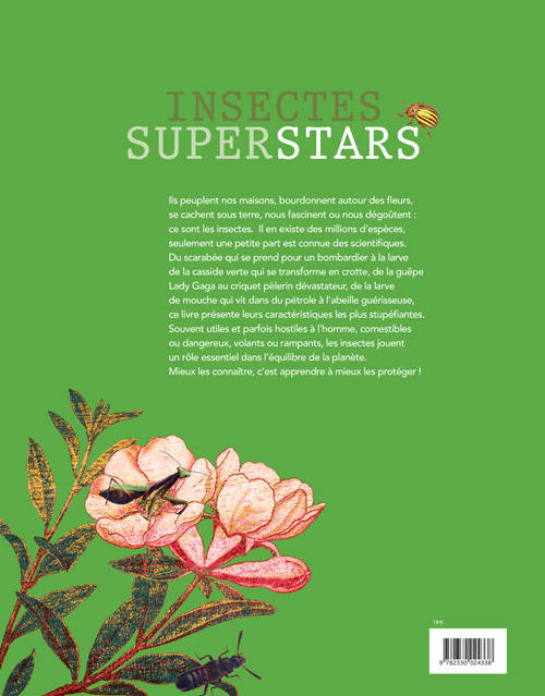Le monde des insectes est fascinant. Il est aussi gigantesque. Les insectes sont les animaux les plus répandus sur terre : les scientifiques ont répertorié près d'un million d'espèces... et ils estiment qu'il en reste plusieurs dizaines de millions à découvrir. À côté, nous, les humains, ne faisons pas le poids ! Même si ce livre comportait des milliers de pages, il serait toujours incomplet. Nous n'avons pas voulu constituer une encyclopédie, mais proposer une petite galerie de portraits. Nous avons sélectionné un peu plus d'une centaine d'insectes : ceux qui nous semblaient les plus étonnants, chacun dans leur domaine, en nous intéressant aux prouesses les plus époustouflantes et les moins connues. Certains insectes sont exceptionnels par de leur mode de vie : les mouches qui vivent dans du pétrole, les papillons capables de voler pendant des milliers de kilomètres, ou les chenilles au venin si toxique qu'on peut mourir rien qu'en les touchant.... D'autres insectes se distinguent par leurs relations avec l'Homme : ils peuvent servir à fabriquer des médicaments, à résoudre les enquêtes policières, ou même à faire la guerre. Dans ce livre, on rencontrera des insectes du coin de la rue et d'autres du bout du monde. On découvrira les talents cachés du moustique ou de la libellule. On fera connaissance avec d'hallucinantes créatures venues du plus profond de la forêt amazonienne. Et il ne faut pas oublier qu'avant de voler, les insectes passent par le stade de larves : c'est le cas de l'asticot ou la chenille, qui se transformeront ensuite en mouche ou en papillon. Ces larves elles aussi ont parfois des comportements incroyables. À travers ces portraits, et les sublimes images qui les accompagnent, nous souhaitons offrir un moment d'émerveillement au lecteur. Nous espérons lui donner envie d'aimer tous les insectes. Car, comme bien d'autres animaux, ils sont souvent menacés de disparition à cause de la pollution ou de la destruction de leur habitat. Chacun d'eux joue pourtant un rôle essentiel dans l'équilibre de notre planète. Mieux connaître les insectes, c'est le premier pas pour apprendre à les protéger.