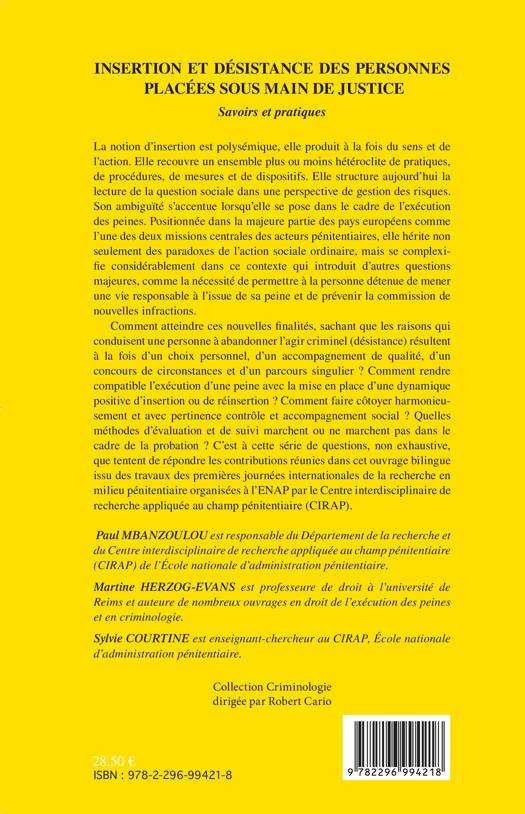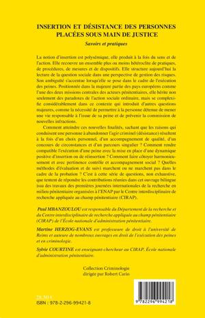 La notion d'insertion recouvre un ensemble de pratiques, de procédures, de mesures et de dispositifs. De nouvelles questions sont introduites, comme celle de permettre à la personne détenue de mener une vie responsable à l'issue de sa peine et de prévenir de nouvelles infractions. Comment atteindre ses finalités, sachant que l'abandon de l'agir criminel (désistance) résulte à la fois d'un choix personnel, d'un accompagnement, d'un concours de circonstances et d'un parcours singulier ? (Quelques contributions en anglais)