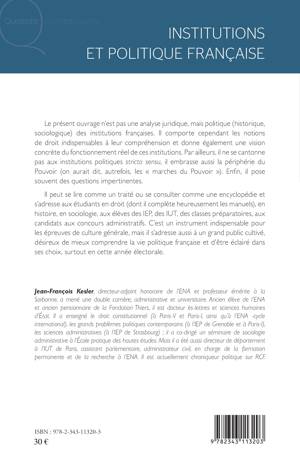 Cet ouvrage n'est pas une analyse juridique, mais politique (historique, sociologique) des institutions françaises. Il comporte cependant les notions de droit indispensables à leur compréhension et donne également une vision concrète du fonctionnement réel de ces institutions. Il peut se lire comme un traité ou se consulter comme une encyclopédie et s'adresse aux étudiants en droit, en sciences humaines ou encore aux élèves des IEP. Il s'avère être un instrument indispensable pour les épreuves de culture générale, mais s'adresse également au grand public désireux de mieux comprendre la vie politique française.