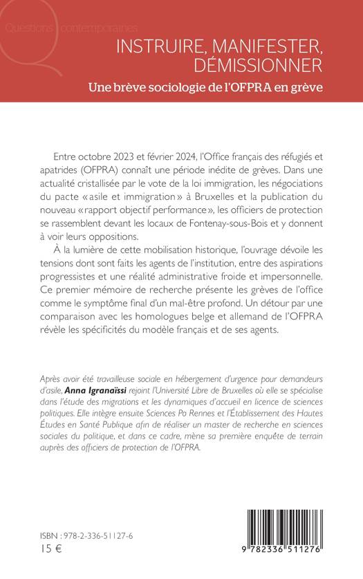 Entre octobre 2023 et février 2024, l'Office français des réfugiés et apatrides (OFPRA) connaît une période inédite de grèves. Dans une actualité cristallisée par le vote de la loi immigration, les négociations du pacte asile et immigration à Bruxelles et la publication du nouveau rapport objectif performance, les officiers de protection se rassemblent devant les locaux de Fontenay-sous-Bois et y donnent à voir leurs oppositions. À la lumière de cette mobilisation historique, l'ouvrage dévoile les tensions dont sont faits les agents de l'institution, entre des aspirations progressistes et une réalité administrative froide et impersonnelle. Ce premier mémoire de recherche présente les grèves de l'office comme le symptôme final d'un mal-être profond. Un détour par une comparaison avec les homologues belge et allemand de l'OFPRA révèle les spécificités du modèle français et de ses agents.