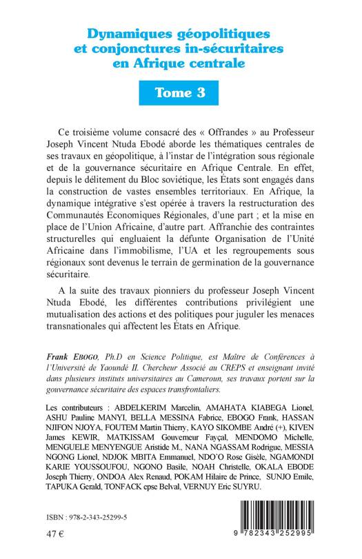 Ce troisième volume aborde les thématiques centrales des travaux du Pr Joseph Vincent Ntuda Ebodé en géopolitique, à l'instar de l'intégration sous régionale et de la gouvernance sécuritaire en Afrique Centrale. En effet, depuis le délitement du Bloc soviétique, les États sont engagés dans la construction de vastes ensembles territoriaux. En Afrique, la dynamique intégrative s'est opérée à travers la restructuration des Communautés Économiques Régionales, d'une part ; et la mise en place de l'Union Africaine, d'autre part. Affranchie des contraintes structurelles qui engluaient la défunte Organisation de l'Unité Africaine dans l'immobilisme, l'UA et les regroupements sous régionaux sont devenus le terrain de germination de la gouvernance sécuritaire. A la suite des travaux pionniers du professeur Joseph Vincent Ntuda Ebodé, les différentes contributions privilégient une mutualisation des actions et des politiques pour juguler les menaces transnationales qui affectent les États en Afrique.