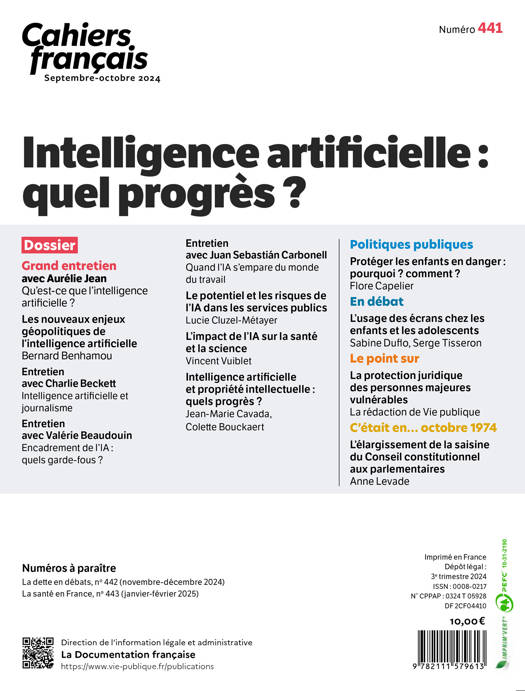 Depuis le lancement de l'application ChatGPT d'Open AI en 2022, l'intelligence artificielle est devenue un sujet central dans le débat public. Certains voient en elle des opportunités prometteuses dans des domaines comme la recherche scientifique, la médecine et la productivité, tandis que d'autres s'inquiètent de son potentiel destructeur, notamment en matière de manipulation, de diffusion de fausses informations et de surveillance de masse. De plus, la crainte de la perte d'emplois, y compris dans des secteurs exigeant une forte compétence cognitive, est également présente. Se questionner sur les conséquences de l'utilisation généralisée de l'IA générative et la régulation de ses usages pour prévenir d'éventuels abus est essentiel. Ce numéro de Cahiers français examine les différentes perspectives liées au développement de l'intelligence artificielle en essayant de trouver un juste milieu entre les prophéties alarmistes et l'engouement technologique.
