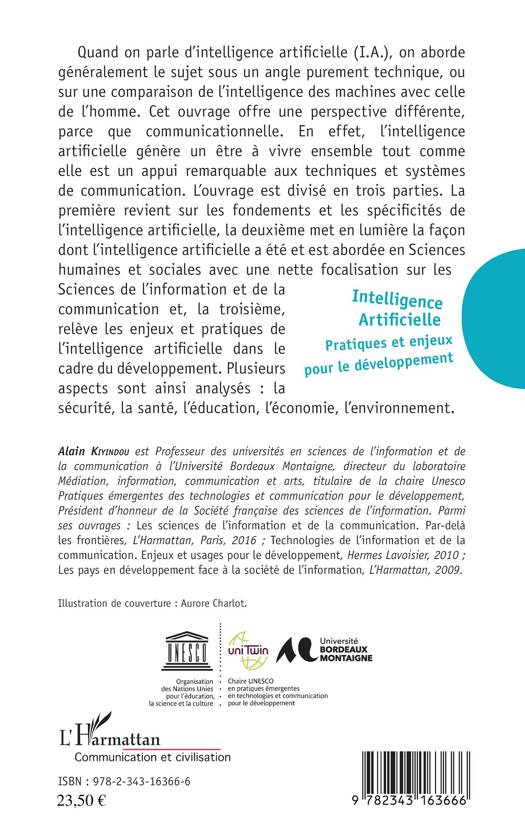 Quand on parle d'intelligence artificielle (I.A.), on aborde généralement le sujet sous un angle purement technique, ou sur une comparaison de l'intelligence des machines avec celle de l'homme. Cet ouvrage offre une perspective différente, parce que communicationnelle. En effet, l'intelligence artificielle génère un être à vivre ensemble tout comme elle est un appui remarquable aux techniques et systèmes de communication. L'ouvrage est divisé en trois parties. La première revient sur les fondements et les spécificités de l'intelligence artificielle, la deuxième met en lumière la façon dont l'intelligence artificielle a été et est abordée en Sciences humaines et sociales avec une nette focalisation sur les Sciences de l'information et de la communication et, la troisième, relève les enjeux et pratiques de l'intelligence artificielle dans le cadre du développement. Plusieurs aspects sont ainsi analysés : la sécurité, la santé, l'éducation, l'économie, l'environnement.