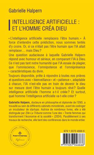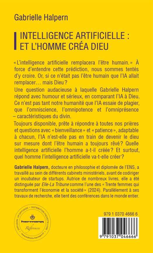 Une question audacieuse à laquelle Gabrielle Halpern répond avec humour et sérieux, en comparant l’IA à Dieu. Ce n’est pas tant notre humanité que l’IA essaie de plagier, que l’omniscience, l’omnipotence et l’omniprésence –  caractéristiques du divin.