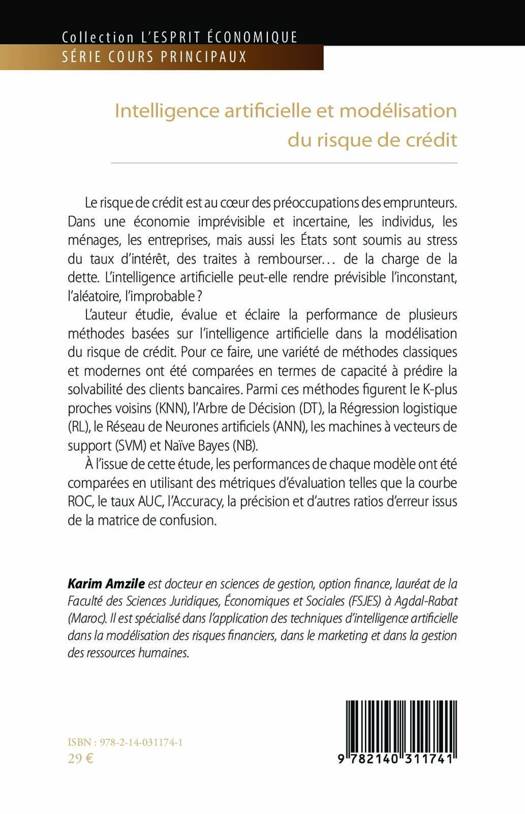 Le risque de crédit est au coeur des préoccupations des emprunteurs. Dans une économie imprévisible et incertaine, les individus, les ménages, les entreprises, mais aussi les États sont soumis au stress du taux d'intérêt, des traites à rembourser... de la charge de la dette. L'intelligence artificielle peut-elle rendre prévisible l'inconstant, l'aléatoire, l'improbable ? L'auteur étudie, évalue et éclaire la performance de plusieurs méthodes basées sur l'intelligence artificielle dans la modélisation du risque de crédit. Pour ce faire, une variété de méthodes classiques et modernes ont été comparées en termes de capacité à prédire la solvabilité des clients bancaires. Parmi ces méthodes figurent le K-plus proches voisins (KNN), l'Arbre de Décision (DT), la Régression logistique (RL), le Réseau de Neurones artificiels (ANN), les machines à vecteurs de support (SVM) et Naïve Bayes (NB). À l'issue de cette étude, les performances de chaque modèle ont été comparées en utilisant des métriques d'évaluation telles que la courbe ROC, le taux AUC, l'Accuracy, la précision et d'autres ratios d'erreur issus de la matrice de confusion.