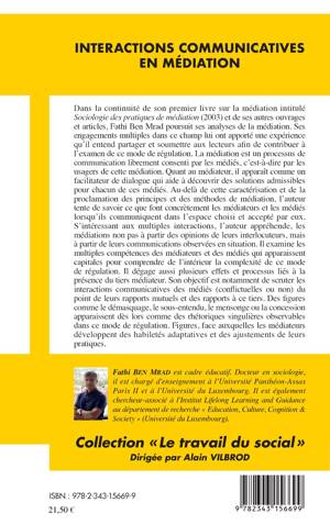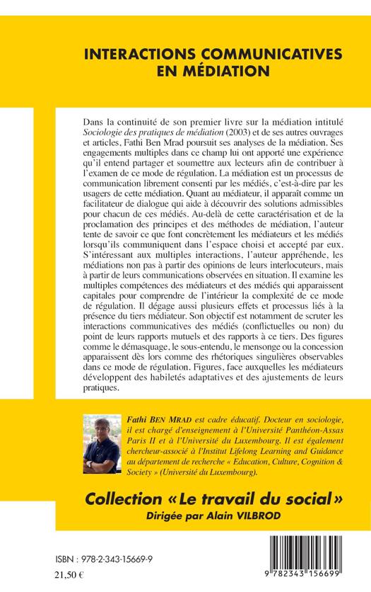 Dans la continuité de son premier livre sur la médiation intitulé "Sociologie des pratiques de médiation" (2002), Fathi Ben Mrad poursuit ses analyses de la médiation. L'auteur appréhende les médiations à partir des communications observées en situation. Son objectif est notamment de scruter les interactions communicatives des médiateurs et des médiés. Des figures comme le démasquage, le sous-entendu, ou la concession apparaissent dès lors comme des rhétoriques singulières observables chez ces médiés. Figures, face auxquelles les médiateurs développent des habilités adaptatives et des ajustements de leurs pratiques.