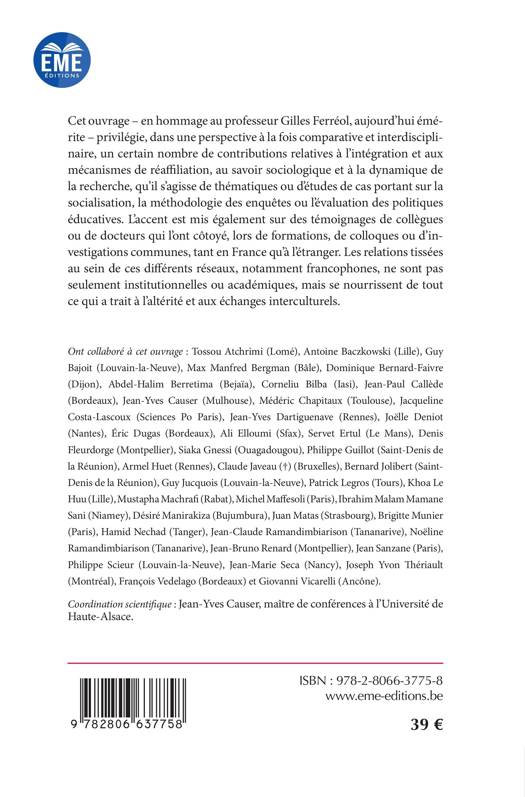 Cet ouvrage - en hommage au professeur Gilles Ferréol, aujourd'hui émérite - privilégie, dans une perspective à la fois comparative et interdisciplinaire, un certain nombre de contributions relatives à l'intégration et aux mécanismes de réaffiliation, au savoir sociologique et à la dynamique de la recherche, qu'il s'agisse de thématiques ou d'études de cas portant sur la socialisation, la méthodologie des enquêtes ou l'évaluation des politiques éducatives.