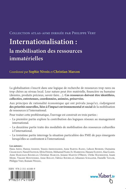 Comment l’entreprise peut-elle, en plus de maîtriser une technologie et/ou un savoir-faire financier, s'appuyer sur ses ressources immatérielles pour réussir son internationalisation ? Maîtriser des ressources immatérielles nécessaires au processus de pénétration des marchés ou d’installation sur place semble aujourd’hui crucial. C’est l’acquisition de cette forme d’intelligence stratégique que donne à appréhender cet ouvrage. Il sera utile aux chercheurs, professionnels et étudiants, qui y trouveront des éléments d’analyse et d’amélioration des pratiques managériales à l’international.