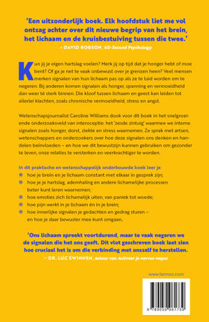 'Een uitzonderlijk boek. Elk hoofdstuk liet me vol ontzag achter over dit nieuwe begrip van het brein, het lichaam en de kruisbestuiving tussen die twee.' - David Robson, 60-Second Psychology 'Ons lichaam spreekt voortdurend, maar te vaak negeren we de signalen die het ons geeft. Dit vlot geschreven boek laat zien hoe cruciaal het is om die verbinding met onszelf te herstellen.' - Dr. Luc Swinnen, auteur van Activeer je nervus vagus 'Een helder, boeiend en slim boek. Het biedt nieuwe inzichten in de subtiele samenwerking tussen brein en lichaam, en laat zien hoe het versterken van die verbinding je welzijn kan verbeteren, je veerkracht kan vergroten en je kan helpen om met meer verbondenheid en diepgang te leven in een wereld die voortdurend verandert.' - Roger Highfield, wetenschappelijk directeur van het Science Museum 'Caroline Williams op haar best: informatief, helder en voortdurend verrassend. Wetenschapsjournalistiek op het hoogste niveau.' - Prof. Dr. Em. Guy Claxton, auteur van Intelligence in the Flesh 'Fascinerend en hoopgevend. We staan nog maar aan het begin van ons begrip van het belang van interoceptie. Dit boek is zowel een heldere verkenning van de wetenschap als een praktische gids om je lichamelijke en mentale gezondheid te transformeren.' - Dr. Monty Lyman,auteur van The Immune Mind