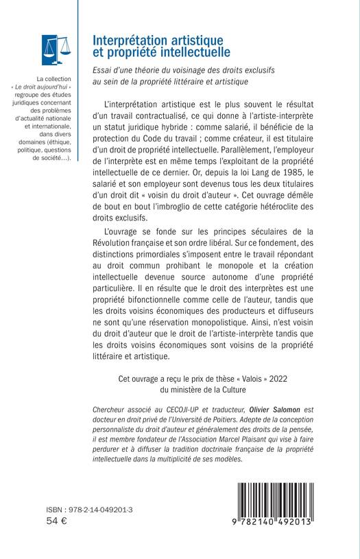 L'interprétation artistique est le plus souvent le résultat d'un travail contractualisé, ce qui donne à l'artiste-interprète un statut juridique hybride: comme salarié, il bénéficie de la protection du Code du travail; comme créateur, il est titulaire d'un droit de propriété intellectuelle. Parallèlement, l'employeur de l'interprète est en même temps l'exploitant de la propriété intellectuelle de ce dernier. Or, depuis la loi Lang de 1985, le salarié et son employeur sont devenus tous les deux titulaires d'un droit dit voisin du droit d'auteur . Cet ouvrage démêle de bout en bout l'imbroglio de cette catégorie hétéroclite des droits exclusifs.