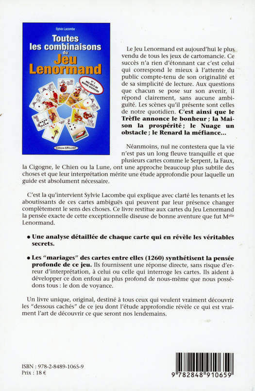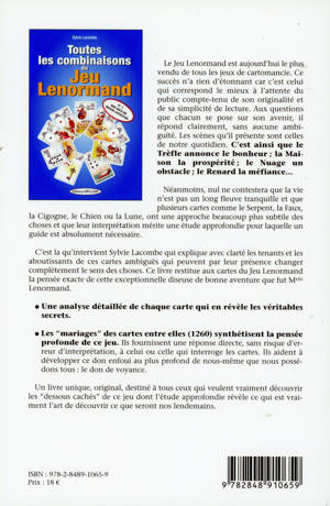 Le Jeu Lenormand est aujourd'hui le plus vendu de tous les jeux de cartomancie. Ce succès n'a rien d'étonnant car c'est celui qui correspond le mieux à l'attente du public compte-tenu de son originalité et de sa simplicité de lecture. Aux questions que chacun se pose sur son avenir, il répond clairement, sans aucune ambiguïté. Les scènes qu'il présente sont celles de notre quotidien. C'est ainsi que le Trèfle annonce le bonheur ; la Maison la prospérité ; le Nuage un obstacle ; le Renard la méfiance... Néanmoins, nul ne contestera que la vie n'est pas un long fleuve tranquille et que plusieurs cartes comme le Serpent, la Faux, la Cigogne, le Chien ou la Lune, ont une approche beaucoup plus subtile des choses et que leur interprétation mérite une étude approfondie pour laquelle un guide est absolument nécessaire. C'est la qu'intervient Sylvie Lacombe qui explique avec clarté les tenants et les aboutissants de ces cartes ambiguës qui peuvent par leur présence changer complètement le sens des choses. Ce livre restitue aux cartes du Jeu Lenormand la pensée exacte de cette exceptionnelle diseuse de bonne aventure que fut Mlle Lenormand. Une analyse détaillée de chaque carte qui en révèle les véritables secrets. Les mariages des cartes entre elles (1260) synthétisent la pensée profonde de ce jeu. Ils fournissent une réponse directe, sans risque d'erreur d'interprétation, à celui ou celle qui interroge les cartes. Ils aident à développer ce don enfoui au plus profond de nous-même que nous possédons tous : le don de voyance. Un livre unique, original, destiné à tous ceux qui veulent vraiment découvrir les dessous cachés de ce jeu dont l'étude approfondie révèle ce qui est vraiment l'art de découvrir ce que seront nos lendemains.