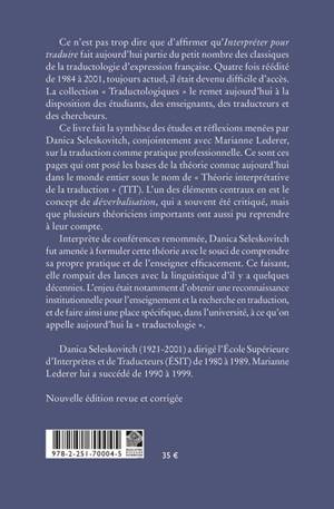 English summary: Re-edition of one of the classic and fundamental texts of translation research. Combining the work of Danica Seleskovitch and Marianne Lederer, the book introduces the key concepts that led to interpretative translation theory and the idea of deverbalization. French description: Ce n'est pas trop dire que d'affirmer qu'Interpreter pour traduire fait aujourd'hui partie du petit nombre des classiques de la traductologie d'expression francaise. Quatre fois reedite de 1984 a 2001, toujours actuel, il etait devenu difficile d'acces. La collection Traductologiques le remet aujourd'hui a la disposition des etudiants, des enseignants, des traducteurs et des chercheurs. Ce livre fait la synthese des etudes et reflexions menees par Danica Seleskovitch, conjointement avec Marianne Lederer, sur la traduction comme pratique professionnelle. Ce sont ces pages qui ont pose les bases de la theorie connue aujourd'hui dans le monde entier sous le nom de Theorie interpretative de la traduction (TIT). L'un des elements centraux en est le concept de deverbalisation, qui a souvent ete critique, mais que plusieurs theoriciens importants ont aussi pu reprendre a leur compte. Interprete de conferences renommee, Danica Seleskovitch fut amenee a formuler cette theorie avec le souci de comprendre sa propre pratique et de l'enseigner efficacement. Ce faisant, elle rompait des lances avec la linguistique d'il y a quelques decennies. L'enjeu etait notamment d'obtenir une reconnaissance institutionnelle pour l'enseignement et la recherche en traduction, et de faire ainsi une place specifique, dans l'universite, a ce qu'on appelle aujourd'hui la traductologie .