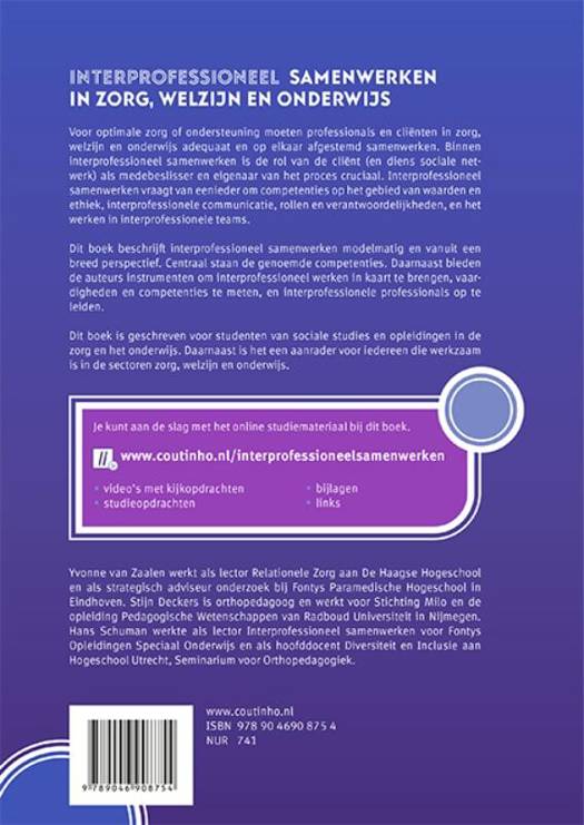 Interprofessioneel samenwerken in zorg, welzijn en onderwijs is geschreven voor studenten van sociale studies en opleidingen in de zorg en het onderwijs. Daarnaast is het geschikt voor iedereen die werkzaam is in de sectoren zorg, welzijn en onderwijs.