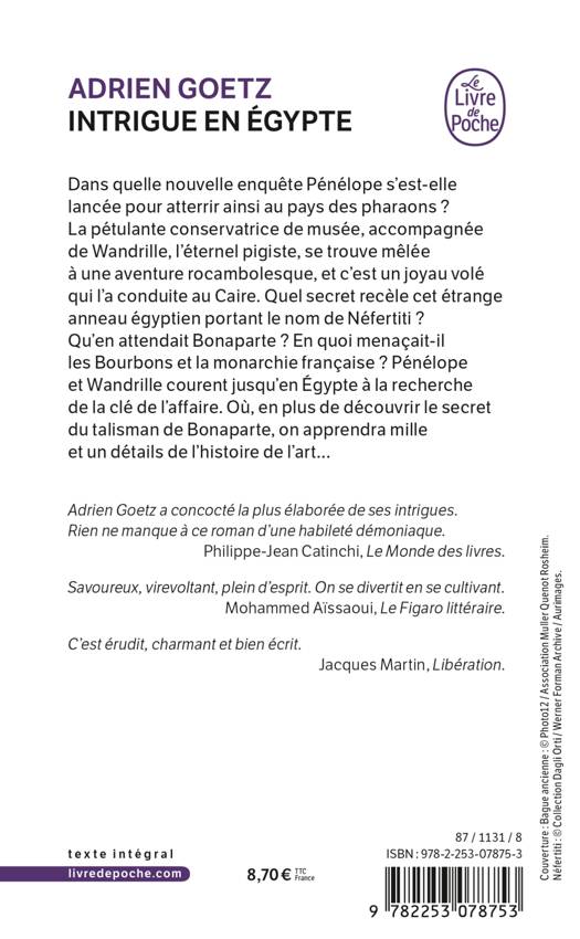 Dans quelle nouvelle aventure Pénélope s’est-elle lancée pour se trouver ainsi au pays des pharaons ? La pétulante conservatrice de musée, accompagnée de Wandrille, l'éternel pigiste, se trouve mêlée à une aventure rocambolesque, où un joyau volé l’a menée au Caire. Quel secret recèle cet étrange anneau égyptien portant le nom de Néfertiti ? Qu'en attendait Bonaparte ? En quoi menaçait-il les Bourbons et la monarchie française ? Pénélope et Wandrille courent jusqu'en Égypte à la recherche de la clé de l'affaire.