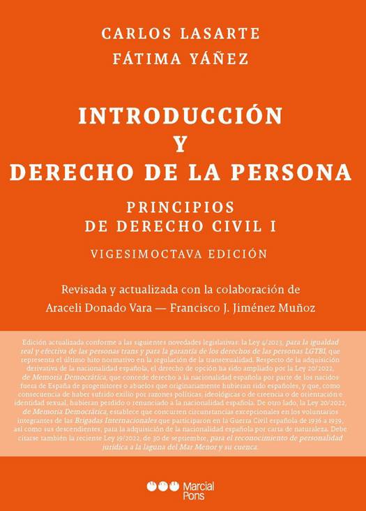 Son varias las razones que permiten enjuiciar admirativamente la obra del profesor Lasarte que inicia su andadura con este primer tomo dedicado, básicamente, al Derecho de la persona y a la tradicionalmente denominada «Parte General» del Derecho civil. La primera de ellas, probablemente, radique en su vibrante y atractiva prosa, que carece de parangón en obras de similar naturaleza. A ella se suman sin duda su magnífica información bibliográfica y jurisprudencial, la riqueza de contenidos y de aspectos reflexivos, así como su excelente actualización.La presente edición se encuentra rigurosamente actualizada, conforme a las nuevas disposiciones normativas de las que se ofrece ya un avance en la propia faja de cubierta de esta edición y, con mayor detalle y extensión, en el prólogo. En cuanto a novedades jurisprudenciales, se incorporan a esta edición dos sentencias del TS, cuyo contenido permite poner de relieve las repercusiones socioeconómicas de la tutela del nasciturus. En la Sentencia 135/2023, el TS confirma la STSJ de Cantabria de 4 de junio de 2021, por la que se reconocía a la demandante, perceptora de una pensión de jubilación desde el 21 de diciembre de 2021, el derecho al complemento de maternidad del 15 por ciento, a resultas de tener en cuenta el parto de trillizos en el año 1980, a los 6 meses de gestación, que fallecieron a las pocas horas de nacer y constaban inscritos en el legajo de abortos del Registro Civil. Pocos días después, el TS Supremo volvió a pronunciarse sobre esta cuestión en la STS 167/2023, resolviendo que no puede ser tenido en cuenta el hijo que nace muerto, aun cuando el fallecimiento se produjera en una gestación a término, si el fallecimiento es anterior al alumbramiento, atendiendo a que la expresión legal «hijos nacidos»? «no admite el cómputo de aquellos partos en los que el feto pudiere haber fallecido antes del momento en el que legalmente debe tenerse por nacido al hijo».