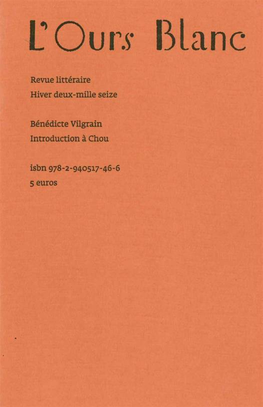 L’Ours Blanc publie des textes brefs et singuliers, en leur consacrant un numéro entier. Le sommaire de la revue s’écrit donc au fur et à mesure des livraisons. Cette volonté d’ouverture témoigne de l’envie d’aborder le champ littéraire comme un espace dont les limites n’ont rien de définitif ni de contraignant. Introduction à chou de Bénédicte Vilgrain est le dixième numéro de L’Ours blanc