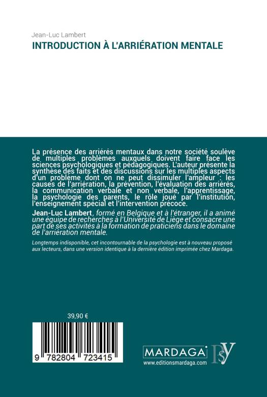 La présence des arriérés mentaux dans notre société soulève de multiples problèmes auxquels doivent faire face les sciences psychologiques et pédagogiques. L'auteur présente la synthèse des faits et des discussions sur les multiples aspects d'un problème dont on ne peut dissimuler l'ampleur: les causes de l'arriération, la prévention, l'évaluation des arriérés, la communication verbale et non verbale, l'apprentissage, la psychologie des parents, le rôle joué par l'institution, l'enseignement spécial et l'intervention précoce.