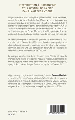 Un jeune homme, étudiant la philosophie et le droit, arrive à Athènes, venant de sa lointaine île de Lesbos. Désireux de perfectionner ses connaissances dans la conception des villes et la gestion de la Cité, il s’adresse à un philosophe connu dans la capitale, Hippodamos. On lui attribue la conception de la reconstruction de la ville de Milet, après sa destruction par les Perses. Disons qu’il a dû y participer. Il aurait également dessiné le plan du port du Pirée. Là non plus, rien n’est sûr. Le vieux philosophe va néanmoins prendre ce jeune homme sous son aile, lui présenter les différentes théories cosmogoniques et philosophiques, lui montrer quelques plans de villes, et lui expliquer comment élaborer une juste constitution de la Cité sur l’exemple de celle de la colonie panhellénique de Thourioi. Le dialogue s’achève lors d’une réception chez Périclès où plane la menace d’une guerre avec Sparte. Reçu par Aspasie, la compagne de Périclès, le jeune Alkéos tente de discuter avec le sophiste Protagoras, aperçoit Sophocle, et finit par s’enivrer du mythe de Prométhée.