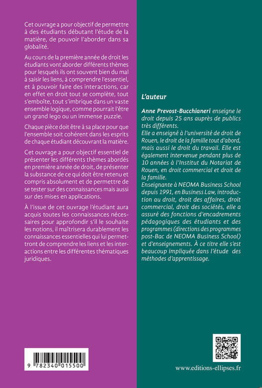 Cet ouvrage a pour objectif essentiel de présenter les différents thèmes abordés en première année de droit, de présenter la substance de ce qui doit être retenu et compris absolument et de permettre de se tester sur des connaissances mais aussi sur des mises en applications.