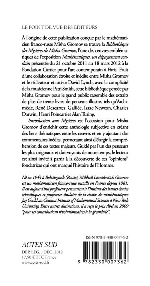 À l'origine de cette publication se trouve la Bibliothèque des Mystères, l'une des oeuvres emblématiques de l'exposition «Mathématiques, un dépaysement soudain», fruit d'une collaboration étroite et inédite entre Misha Gromov et le réalisateur et artiste David Lynch, avec la complicité de la musicienne Patti Smith. Cette bibliothèque pensée par Misha Gromov pour le grand public rassemble trente livres choisis par lui, présentés sous la forme d'une installation sonore et film