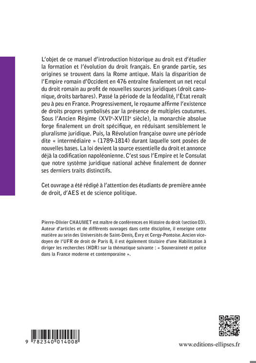 L’objet de ce manuel d’introduction historique au droit est d’étudier la formation et l’évolution du droit français. En grande partie, ses origines se trouvent dans la Rome antique. Mais la disparition de l’Empire romain d’Occident en 476 entraîne finalement un net recul du droit romain au profit de nouvelles sources juridiques (droit canonique, droits barbares). Passé la période de la féodalité, l’État renaît peu à peu en France. Progressivement, le royaume affirme l’existence de droits propres symbolisés par la présence de multiples coutumes. Sous l’Ancien Régime (XVIe-XVIIIe siècle), la monarchie absolue forge finalement un droit spécifique, en réduisant sensiblement le pluralisme juridique. Puis, la Révolution française ouvre une période dite « intermédiaire » (1789-1814) durant laquelle sont posées de nouvelles bases. La loi devient la source essentielle du droit et annonce déjà la codification napoléonienne. C’est sous l’Empire et le Consulat que notre système juridique national achève finalement de donner ses derniers traits distinctifs.