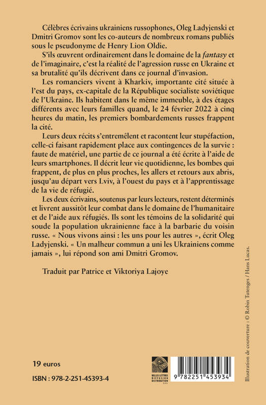 Les deux écrivains, soutenus par leurs lecteurs, restent déterminés et livrent aussitôt leur combat dans le domaine de l’humanitaire et de l’aide aux réfugiés. Ils sont les témoins de la solidarité qui soude la population ukrainienne face à la barbarie du voisin russe. « Nous vivons ainsi : les uns pour les autres », écrit Oleg Ladyjenski. « Un malheur commun a uni les Ukrainiens comme jamais », lui répond son ami Dmitri Gromov.