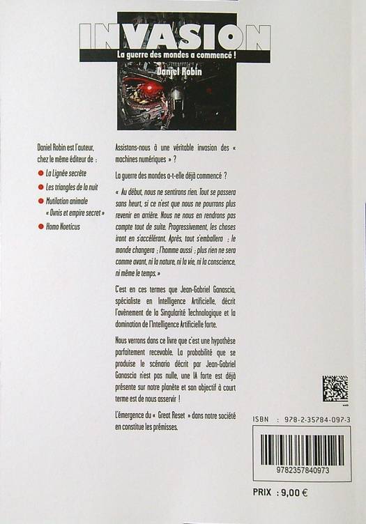 Assistons-nous à une véritable invasion des « machines numériques » ? La guerre des mondes a-t-elle déjà commencé ? « Au début, nous ne sentirons rien. Tout se passera sans heurt, si ce n’est que nous ne pourrons plus revenir en arrière. Nous ne nous en rendrons pas compte tout de suite. Progressivement, les choses iront s’accélérant. Après, tout s’emballera ; le monde changera ; l’homme aussi ; plus rien ne sera comme avant, ni la nature, ni la vie, ni la conscience, ni même le temps. » C’est en ces termes que Jean-Gabriel Ganascia, spécialiste en Intelligence Artificielle, décrit l’avènement de la Singularité Technologique et la domination de l’Intelligence Artificielle forte. Nous verrons dans ce livre que c’est une hypothèse parfaitement recevable. La probabilité que se produise le scénario décrit par Jean-Gabriel Ganascia n’est pas nulle, une IA forte est déjà présente sur notre planète et son objectif à court terme est de nous asservir !