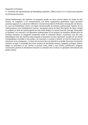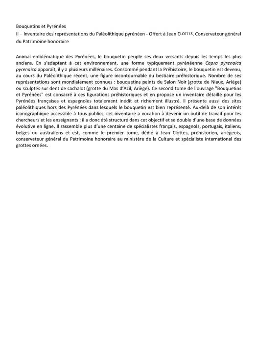 Le bouquetin, animal emblématique des Pyrénées est une figure récurrente de l'art préhistorique. Dédié à Jean Clottes, préhistorien et spécialiste des grottes ornées à l'international, cet ouvrage à la fois savant et accessible, se partage en 2 tomes. Le premier est consacré à l'histoire et l'éthologie et le second est un inventaire richement illustré des représentations préhistoriques de bouquetin dans les Pyrénées, mais aussi dans quelques autres régions proches.