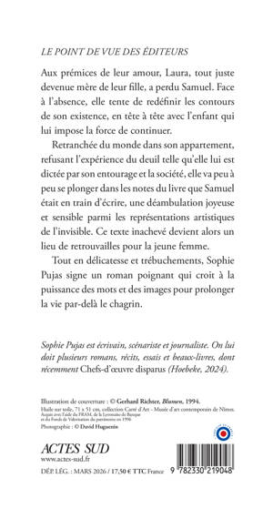 Aux prémices de leur amour, Laura, tout juste devenue mère de leur fille, a perdu Samuel. Face à l'absence, elle tente de redéfinir les contours de son existence, en tête à tête avec l'enfant qui lui impose la force de continuer. Retranchée du monde dans son appartement, refusant l'expérience du deuil telle qu'elle lui est dictée par son entourage et la société, elle va peu à peu se plonger dans les notes du livre que Samuel était en train d'écrire, une déambulation joyeuse et sensible parmi les représentations artistiques de l'invisible. Ce texte inachevé devient alors un lieu de retrouvailles pour la jeune femme. Tout en délicatesse et trébuchements, Sophie Pujas signe un roman poignant qui croit à la puissance des mots et des images pour prolonger la vie par-delà le chagrin.