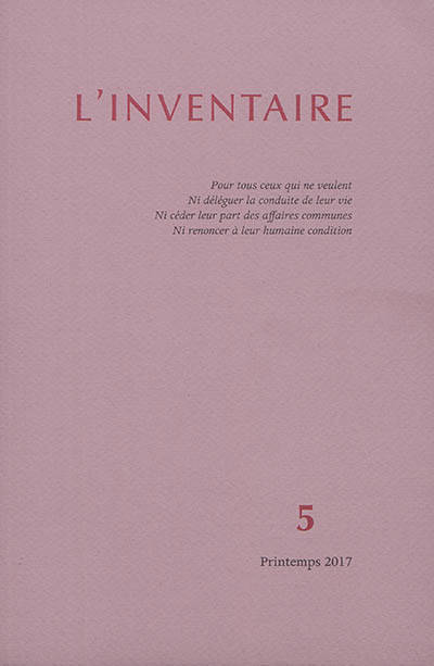 Notre revue tente de faire progresser l'inventaire de ce qui, en théorie et en pratique, reste à défendre, mérite d'être reconsidéré ou doit être écarté pour favoriser l'émancipation individuelle et collective. Nous espérons ainsi, en diffusant d'anciennes idées et en en proposant de nouvelles, contribuer à l'élaboration d'une culture critique commune. Sommaire du numéro 5 : Annie Gouilleux, « Notes sur Golden Days de Lewis Mumford » / Alfonso Berardinelli, « Limite et mémoire, variations sur Christopher Lasch » / « Citations mêlées » / Nicolas Gey, « Nouveau poème tiré du recueil Bouquet final à paraître » / « Le cas Stiegler » / Nicolas Eyguesier, « Commentaires sur Les Français jihadistes ».