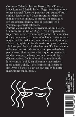 Costanza Calenda, Jeanne Barret, Flora Tristan, Hedy Lamarr, Matilda Joslyn Gage ; ces femmes ont toutes marqué l'histoire, pourtant qui, aujourd'hui, connaît leurs noms ? Leurs inventions dans les domaines scientifiques, politiques ou artistiques ont été déterminantes, mais la postérité les a systématiquement éclipsées. Faisant le constat de cette invisibilisation, Hélène Giannecchini et Chloé Dugit-Gros s'emparent des trajectoires de seize femmes, d'époques et de milieux divers, pour remettre en lumière leurs contributions majeures à la médecine, au cinéma, à la physique, à la cartographie des fonds marins ou plus largement à la lutte pour les droits des femmes. Tâchant de leur redonner une voix, de les incarner par le dessin et par le texte, elles retracent leurs questionnements, rendent compte de leurs découvertes et de leur détermination. Ce livre tente, à sa manière, de lutter contre l'oubli, car si le mot « inventrice » n'est jamais utilisé, si ces femmes sont écartées des livres d'histoire, c'est un pan entier de notre matrimoine qui disparaît.
