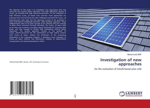 The objective of this study is to investigate new approaches that may overcome the issuesof phase separation and high dislocation density in InxGa1-xN materials with high indiumconcentration, for the realization of high efficiency InxGa1-xN based solar cells.Two novel approaches are proposed that may overcome the basic challenges involvedin the InxGa1-xN heterojunction solar cells. The first approach consists in the growthof a thick multi-layered InGaN/GaN absorber, called Semibuk approach. These GaNinterlayers need to be thick enough to be effective and thin enough to allow carrier trans-port through tunneling. The InxGa1-xN layers need to be thick and numerous enoughto absorb efficiently the incoming light beam, and thin enough to remain fully strainedand without phase separation. The second approach consists in the growth of InxGa1-xNnano-structures for the achievement of high indium content thick InxGa1-xN layers. Itallows the elimination of the preexisting dislocations in the underlying template. It alsoallows strain relaxation of InxGa1-xN layers without any dislocations, leading to higherindium incorporation and reduced piezoelectric effect.