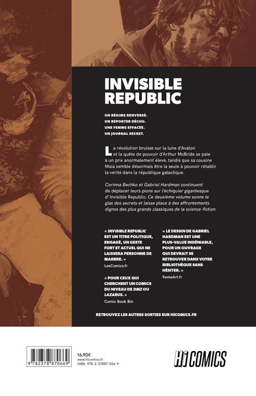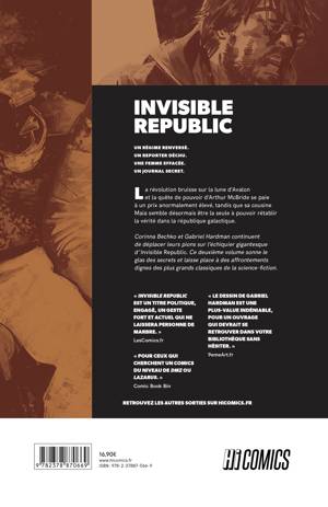 La révolution bruisse sur la lune d'Avalon et la quête de pouvoir d'Arthur McBride se paie désormais trop cher, tandis que sa cousine Maia semble être la seule à pouvoir rétablir la vérité dans la république galactique. Corinna Bechko et Gabriel Hardman continuent de déplacer leurs pions sur l'échiquier gigantesque d'Invisible Republic, dans une partie qui semble condamnée à ne plus jamais pouvoir revenir en arrière. Ce second volume sonne le glas des secrets et laisse place à des affrontements dignes des plus grands classiques de la Science-Fiction.