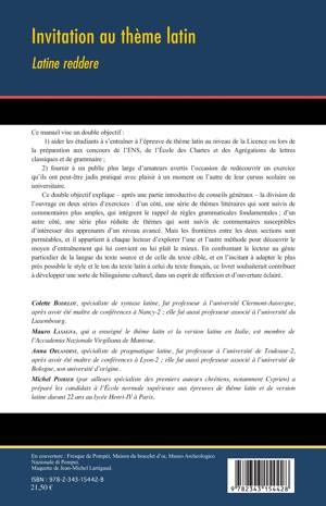 En confrontant le lecteur au génie particulier de la langue du texte source et de celle du texte cible, et en l'incitant à adapter le plus près possible le style et le ton du texte latin à celui du texte français, ce livret souhaiterait contribuer à développer une sorte de bilinguisme culturel, dans un esprit de réflexion et d'ouverture éclairé. L'ouvrage est divisé en deux séries d'exercices : d'un côté, une série de thèmes littéraires ; d'un autre côté, une série plus réduite de thèmes qui sont suivis de commentaires susceptibles d'intéresser des apprenants d'un niveau avancé.