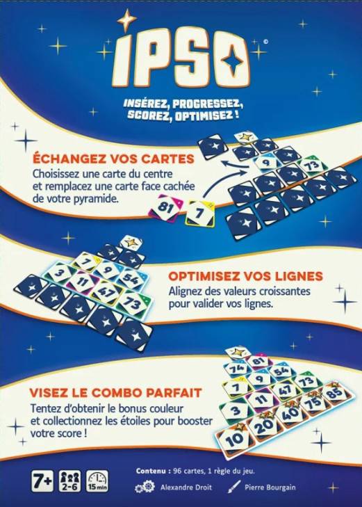 Un jeu rapide et tactique où chaque carte compte ! Créez les meilleures lignes croissantes pour marquer un maximum de points. Échangez malin : piochez une carte du centre et remplacez une carte face cachée de votre pyramide. Alignez les couleurs, collectionnez les étoiles et visez les combos parfaits pour booster votre score. Le jeu propose 2 variantes, dont un mode tournoi et des bonus pour les lignes paires ou impaires. A vous d'optimiser!