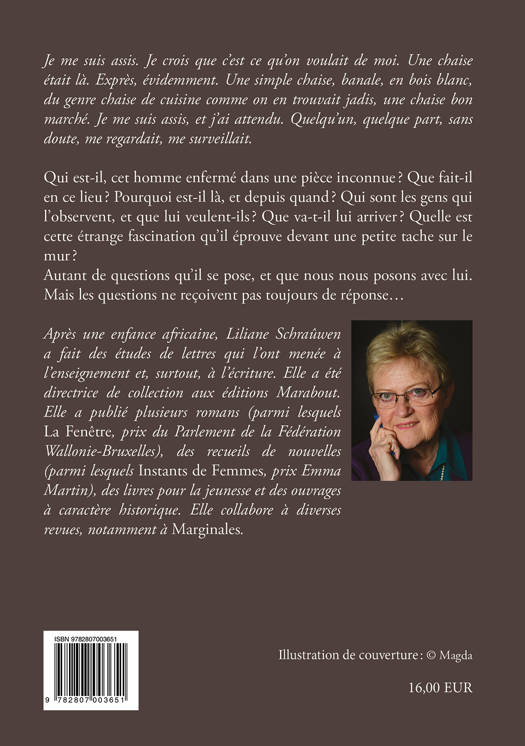 "Je me suis assis. Je crois que c’est ce qu’on voulait de moi. Une chaise était là. Exprès, évidemment. Une simple chaise, banale, en bois blanc, du genre chaise de cuisine comme on en trouvait jadis, une chaise bon marché. Je me suis assis, et j’ai attendu. Quelqu’un, quelque part, sans doute, me regardait, me surveillait. Je me suis assis, et j’ai attendu. Quelqu’un, quelque part, sans doute, me regardait, me surveillait. Derrière une fenêtre que je ne voyais pas, derrière une glace sans tain, ou par le trou de la serrure, ou par une f<br /> Je me suis demandé ce qu’on voulait de moi. Sûrement, il y avait des gestes, des mouvements, des attitudes à adopter. J’avais beau réfléchir, je ne trouvais pas. Je ne savais même pas pourquoi j’étais là, ni comment j’y étais arrivé. Cela se produit fréquemment, comme des absences, des trous. Je suis quelque part, seul ou non, et je sens bien qu’il y a quelque chose à dire, quelque chose à faire, mais quoiâ? Cela se passe tout le temps. Souvent aussi, je me vois comme de l’extérieur, dans une chambre close, ou dans un couloir, un salon, une cuisine, une salle de bain, une salle de classe, dans la rue, sur une plage, et je me dis Mais qu’est-ce que je fais là, et comment j’y suis venuâ?"<br /><br /> Qui est cet homme, André, enfermé dans une pièce inconnue ? Pourquoi est-il là, et depuis quand ? Que va-t-il lui arriver ? Quelle est cette étrange fascination qu’il éprouve devant une petite tache sur le mur ?<br /> Peu à peu, des éléments de sa vie passée lui reviennent, la sensation d’avoir été à la fois lui-même et quelqu’un d’autre, ou même quelque chose, une plante, un objet... D’avoir été à la fois, ou alternativement, quelque part et dans d’autres univers. Des mots lui reviennent, dont il cherche à pénétrer le sens profond. Et des images terribles, sanglantes...<br /> Des gens, hors de la pièce, l’observent et notent. Ils cherchent à comprendre cet homme, qui aurait assassiné sa compagne. Mais pourquoi ? Est-il fou ? Et quelle sorte de folie ? Ou un manipulateur ?<br /> Le lecteur se pose avec eux ces questions, jusqu’au coup de théâtre final, qui le fait basculer dans le fantastique.<br /> MOTS CLÉS<br /> Roman. Huis clos. Suspense. Crime. Folie. Fantastique.<br /><br /> L’AUTEUR<br /> Après une enfance africaine, Liliane Schraûwen a fait des études de lettres qui l’ont menée à l’enseignement et, surtout, à l’écriture. Elle a publié une quinzaine de romans et recueils de nouvelles (dont La mer éclatée, finaliste du prix Rossel, La Fenêtre, prix du Parlement, Instants de Femmes, prix Emma Martin), ainsi que des ouvrages historiques et de la poésie. Elle collabore à diverses revues, notamment à Marginales.<br />