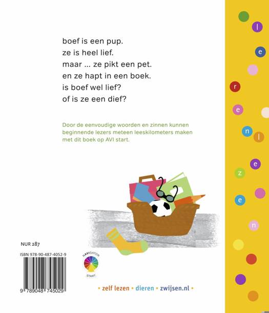 boef is een pup. ze is heel lief. maar … ze pikt een pet. en ze hapt in een boek. is boef wel lief? of is zij een dief?