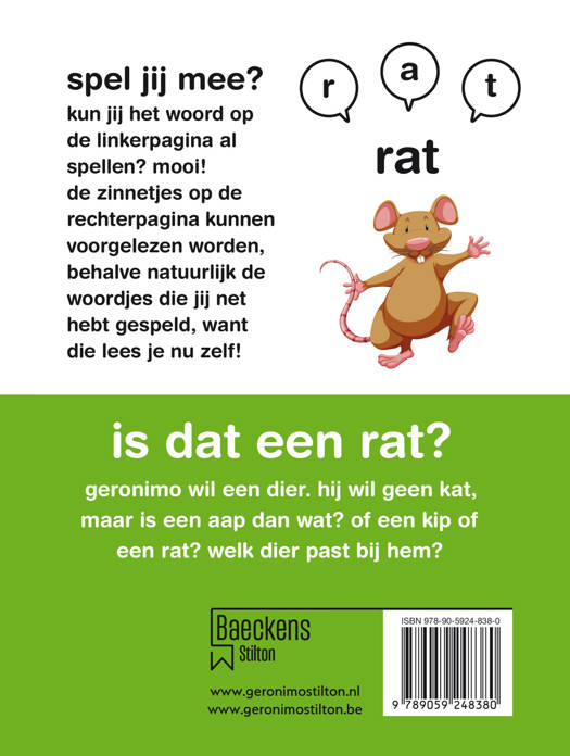 Spel het woordje op de linker pagina. Lukt je dat? Top! Nu kan degene met wie je dit boekje leest de zinnetjes op de rechterpagina voorlezen, behalve natuurlijk de woordjes die jij net hebt gespeld, want die lees je nu zelf! Dit deel gaat over dieren. Geronimo heeft al veel dieren ontmoet. Sommige vond hij lief en andere eng. Lees jij mee?