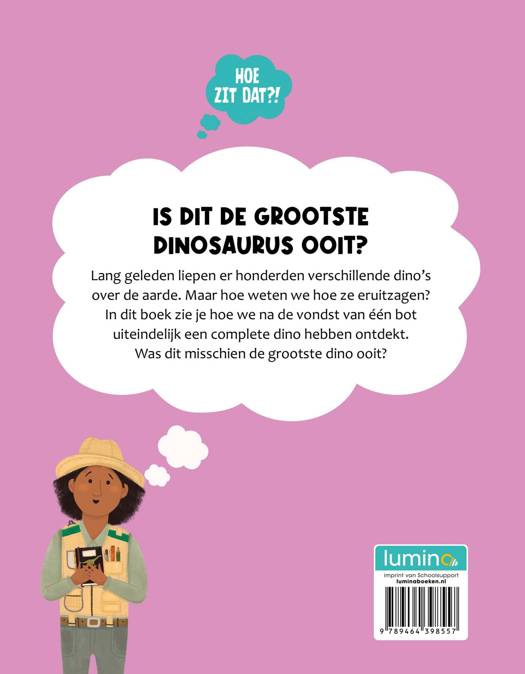 Lang geleden liepen er honderden verschillende dino’s over de aarde. Door het opgraven van fossielen weten we hoe ze eruitzagen. Dit boek zoomt in op de vondst van een gigantisch dinobot. Je leest hoe paleontologen uiteindelijk een complete dino hebben ontdekt. Was dit misschien de grootste dino ooit?