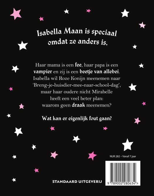 Isabella Maan is speciaal omdat ze anders is. Haar mama is een fee, haar papa is een vampier en zij is een beetje van allebei. Isabella wil Roze Konijn meenemen naar ‘Breng-je-huisdier-mee-naar-school-dag‘, maar haar oudere nicht Mirabelle heeft een veel beter plan: waarom geen draak meenemen? Wat kan er eigenlijk fout gaan?