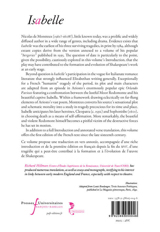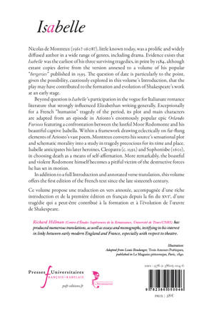 Nicolas de Montreux (1561 ? -1608 ?), little known today, was a prolific and widely diffused author in a wide range of genres, including drama. Evidence exists that Isabelle was the earliest of his three surviving tragedies, in print by 1584, although extant copies derive from the version annexed to a volume of his popular « bergeries » published in 1595. The question of date is particularly to the point, given the possibility, cautiously explored in this volume's Introduction, that the play may have contributed to the formation and evolution of Shakespeare's work at an early stage.
