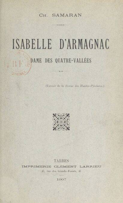 D’Armagnac est un nom gascon souvent entendu dans les pages de l'histoire de France. Isabelle naquit aux environs de 1430, et était la dernière fille du comte Jean IV d’Armagnac ; suivant la coutume fort répandue à cette époque, elle fut baptisée du nom de sa mère, Isabelle, fille de Charles III, roi de Navarre. Dans ce livre, extrait de la Revue des Hautes-Pyrénées, Charles Samaran nous raconte le destin tragique de celle qui fut rapidement victime des agissements de son frère Jean, vicomte de Lomagne...