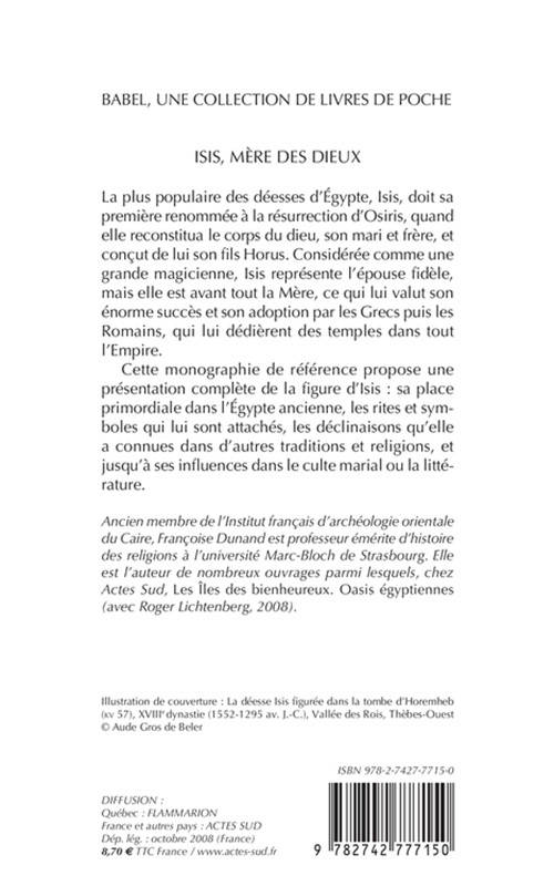 La plus populaire des déesses d'Egypte, Isis, doit sa première renommée à la résurrection d'Osiris, quand elle reconstitua le corps du dieu, son mari et frère, et conçut de lui son fils Horus. Considérée comme une grande magicienne, Isis représente l'épouse fidèle, mais elle est avant tout la Mère, ce qui lui valut son énorme succès et son adoption par les Grecs puis les Romains, qui lui dédièrent des temples dans tout l'Empire. Cette monographie de référence propose une présentation complète de la figure d'Isis : sa place primordiale dans l'Egypte ancienne, les rites et symboles qui lui sont attachés, les déclinaisons qu'elle a connues dans d'autres traditions et religions, et jusqu'à ses influences dans le culte marial ou la littérature. «Ancien membre de l'Institut français d'archéologie orientale du Caire, Françoise Dunand est professeur émérite d'histoire des religions à l'université Marc-Bloch de Strasbourg. Elle est l'auteur de nombreux ouvrages parmi lesquels, chez Actes Sud, Les Iles des bienheureux. Oasis égyptiennes (avec Roger Lichtenberg, 2008).»